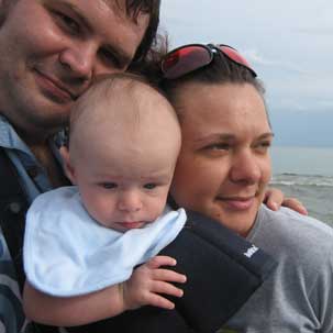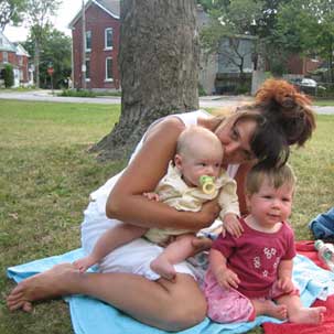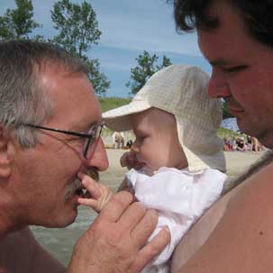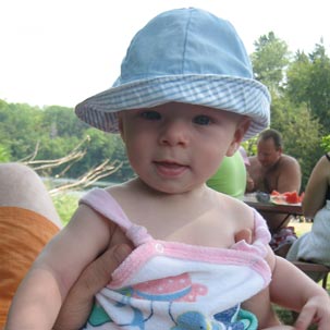 Udało się nam, to znaczy Pitulowi i mnie, bo tatko musiał niestety dzielnie pracować, spędzić większość sierpnia w Kingston, u babci Ani i prababci Weroniki. To były nasze mini wakacje. Pogoda przecudna, powietrze krystaliczne, wiaterek i słonko.. Żyć, nie umierać... Rankiem pachniało rosą, wieczorem ćwierkały świerszcze, upał zalewał równo przystrzyżone trawniki, a jezioro parowało gotując świat w mglistej poświacie. Chłonęliśmy z Adaśkiem, jak wymęczone gąbki, ten cudny świat, to błogie lenistwo, rozciągając się a to na łące, a to w lesie, czy nad wodą. Bardzo podobało nam się to nicnierobienie. Gdzieś pomiędzy książką i dumaniem o niebieskich migdałach, robiłam zdjęcia, pływałam i moczyłam maciupcie stopki Pitulka w jeziorze. Adaśko fikał zawzięcie nóżkami z radością nasiąkając pieluchę, która podtopionym ciężarem cieczy, tej od górnej jak i tej od dolnej, nieubłagalnie zakotwiczał go na piasku jak podziurawiony pontonik.
