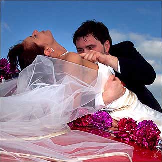 Niedługo później, cała przeobrażona ‘panna-pod-wrażeniem’, podążała samotnie taksówka na drugi koniec miasta. Wyglądająca całkiem przedziwnie, w jean’sach, zwiewnej pelerynce fryzjerskiej i z welonem na głowie, szybowała pospiesznie do domu, w którym to niebawem zawitać miały babcia, mama, dwie przyjaciółki i fotograf... |